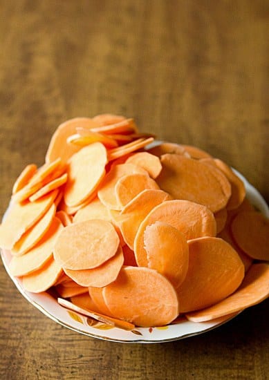 - 2 pounds (907.18 g) sweet potatoes, peeled and sliced about 1/8-inch thick