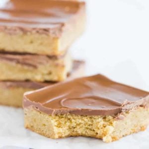 I revamped this old recipe to use my favorite plain blondie recipe as a base, then topped with melted Hershey’s Symphony bars.