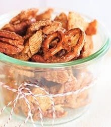 Cinnamon-Sugar Candied Chex Mix with Pecans and Pretzels