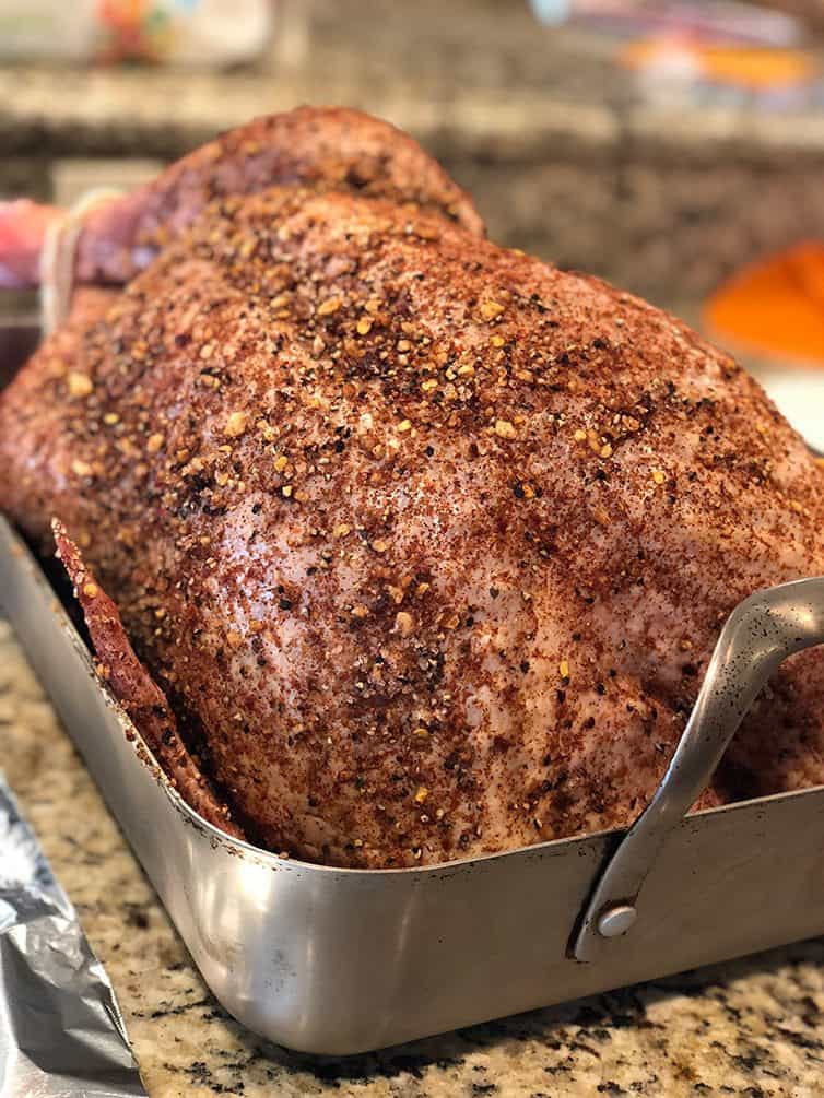 Hi Judy, It doesnโt really smell up the house at all, surprisingly! The dry brine rub I used this year I found in the Wall Street Journal (we get it at home, but I found the article here). Iโm not sure if you can access it, but it was a combination of kosher salt, dark brown sugar, sweet paprika, crushed red pepper flakes, ground dried apple, and cloves. I put the rub on Tuesday evening and left the turkey in the refrigerator, uncovered, until we cooked it on Thursday.
