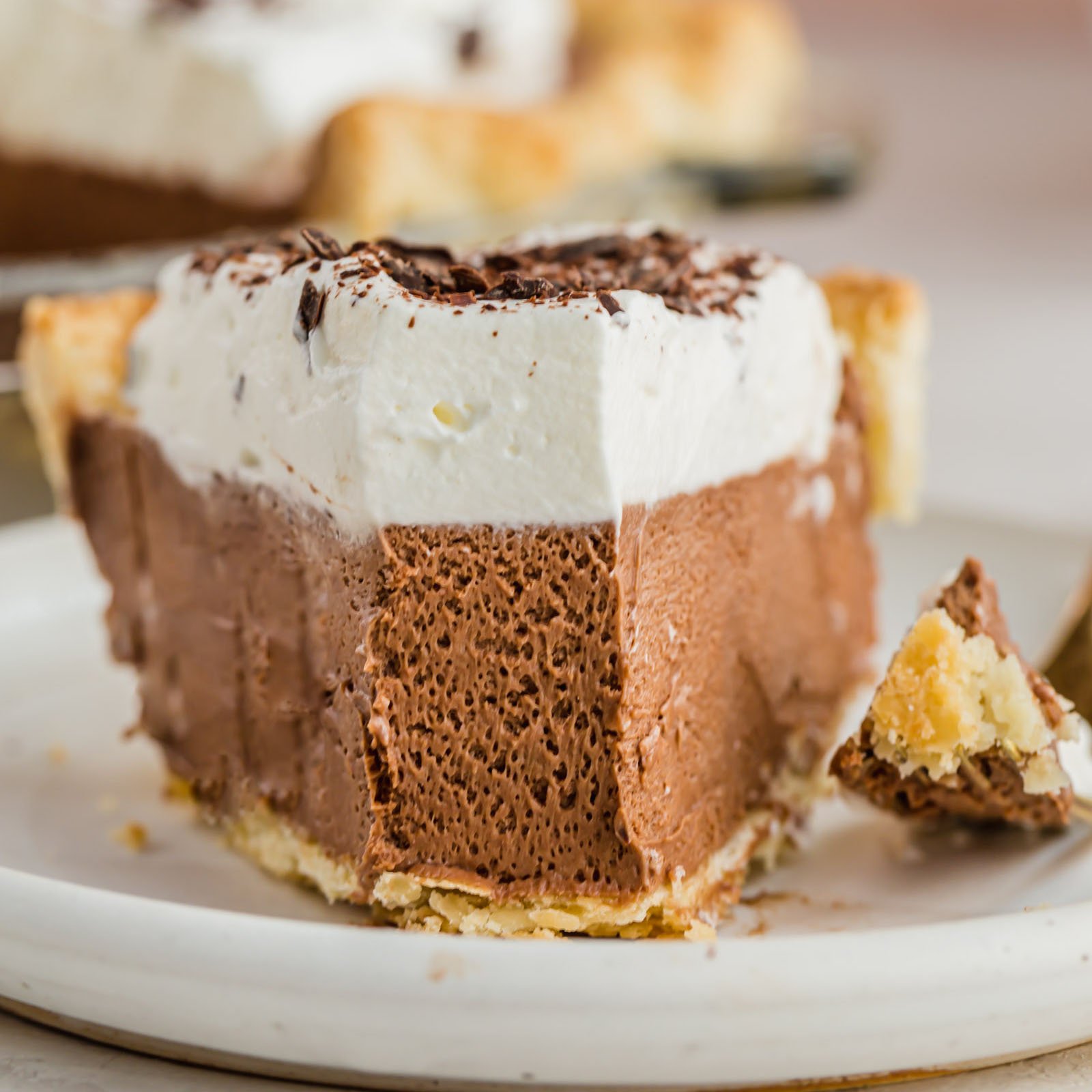 French Silk Pieย โ This creamy French silk pie starts with my favorite pie crust, is loaded with a smooth, mousse-like chocolate filling and topped with fresh whipped cream.