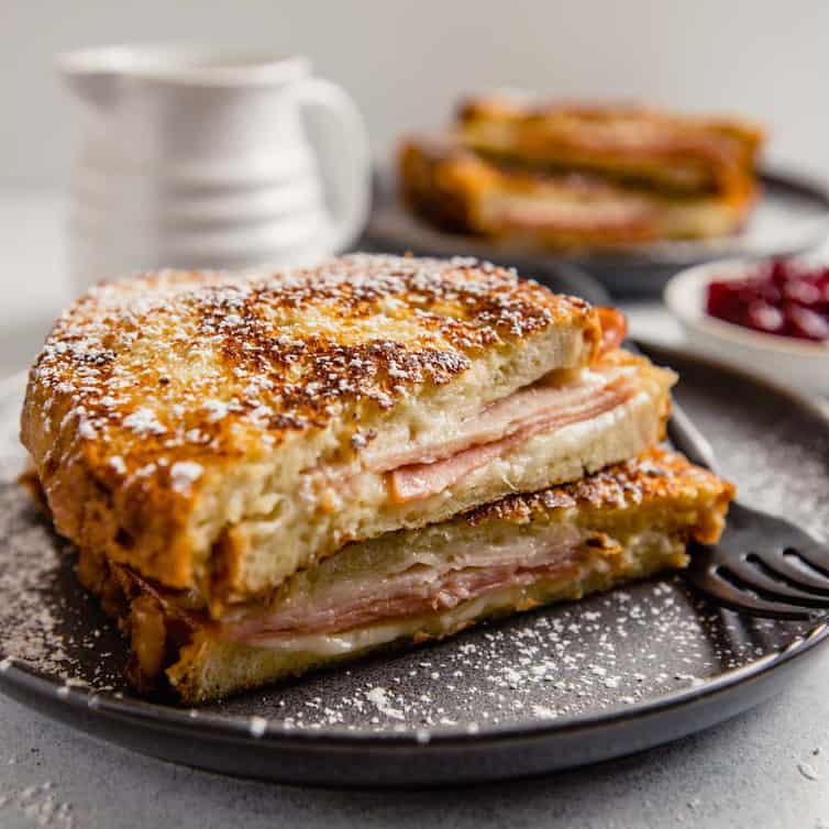 Monte Cristo Sandwichย โ This Monte Cristo sandwich is the most elevated grilled cheese/French toast hybrid in existence! Crispy challah, melty Swiss cheese, turkey, and salty ham are dunked in a custard mixture, pan-fried, and served with maple syrup and fruit preserves on the side for dipping.