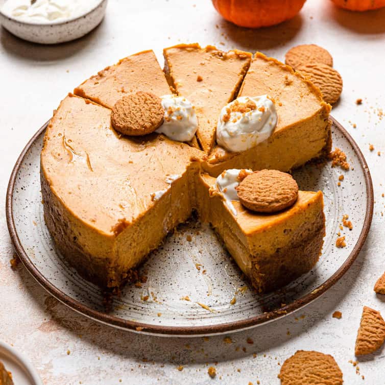 Pumpkin Cheesecakeย โ The November Bake-Along recipe! This perfectly decadent pumpkin cheesecake has a gingersnap crust and a thick, creamy filling. Using common pantry items, boxed cookies, and canned pumpkin, this delicious recipe is a simple crowd-pleaser!