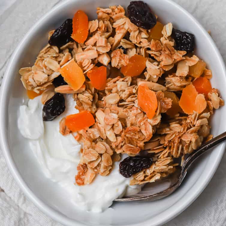 Easy Homemade Granolaย โ This easy homemade granola is sweetened with maple syrup (or honey), mixed with almonds and dried fruit, bakes up super chunky, and is the absolute best!