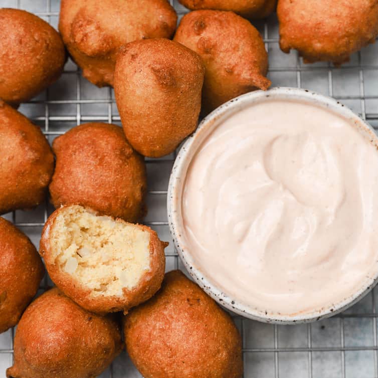 Hush Puppies with Spicy Dipping Sauceย โ These hush puppies are a Southern classic and this recipe is absolutely the best; a simple batter that comes together quickly and only takes minutes to fry up. A perfect side dish or appetizer.