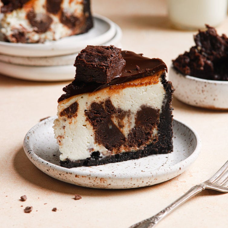 Brownie Mosaic Cheesecake – A luscious cheesecake with cubes of brownies baked right inside, with an Oreo crumb crust and chocolate ganache topping.
