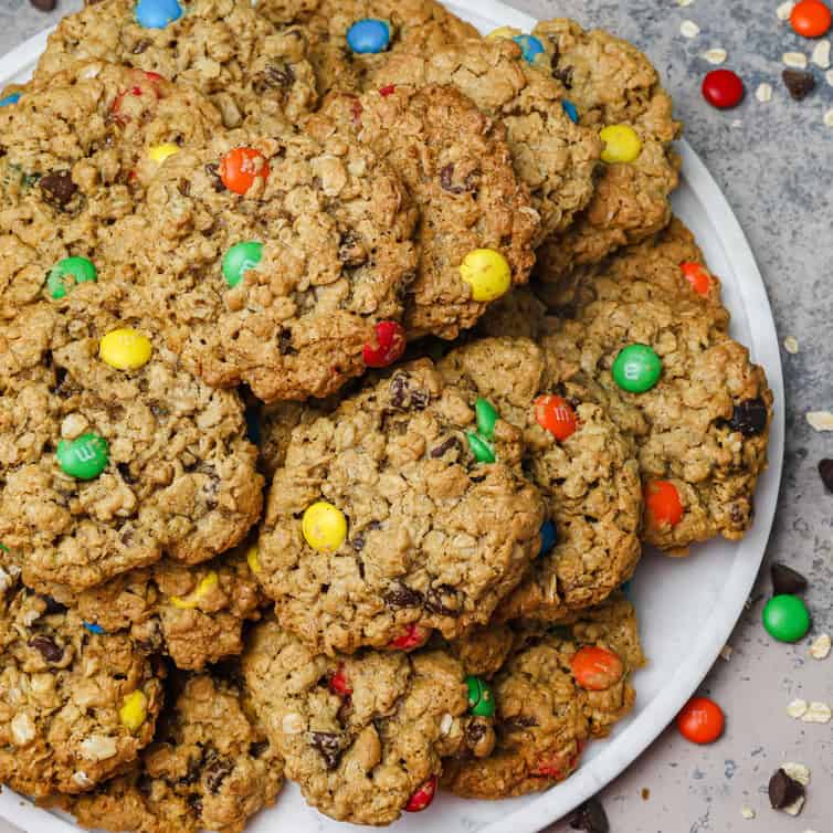 Monster Cookiesย โ Monster cookies are everything good that there is about cookie-baking and candy-eating. These classic cookies are loaded with peanut butter, oats, chocolate chips, and M&Ms; they bake up soft, chewy, and thick, and are absolutely irresistible!