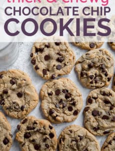These large, bakery-style thick and chewy chocolate chip cookies stay soft for days and are a huge family favorite. Made with melted butter, a high brown sugar to white sugar ratio, and an extra egg yolk to ensure super soft cookies, they require NO chilling time and are the perfect after-school snack.
