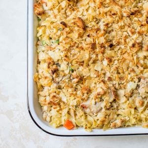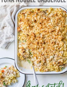 I honestly am not sure that Iโve ever had tuna noodle casserole before making it myself for the first time. Crazy, right?! Iโve always been a fan of tuna, sometimes eating a can of it for lunch during college, so I was excited to finally make this iconic casserole, and from scratch!
