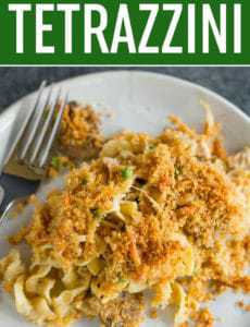 I wonโt lie. I ate this tetrazzini for lunch and dinner multiple days in a row after making it. Thatโs sort of a big deal for me, as I tend to accumulate leftovers without finishing them off. Ask my husband about the sheer number of take out and Tupperware containers that threaten to take over a refrigerator. Itโs downright scary. Not this time, though. This time I finished every last morsel and was seriously bummed when I realized it was gone. I secretly didnโt even want to share it. Between the noodles, the creamy sauce, mushrooms, turkey and peas, it was baked perfection.