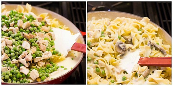 - Drain the pasta when it is finished, then add the cooked pasta, mushrooms, turkey and peas to the sauce in the skillet, tossing everything together until it is evenly coated. Add half of the Gruyere and half of the Parmesan cheese, stirring until the cheese is melted. Add salt and pepper to taste. Pour the mixture into the prepared baking dish.