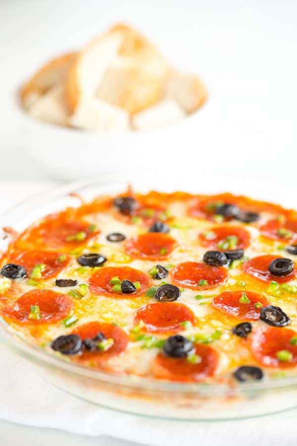 Pizza Dipย โ This easy pizza dip recipe features layers of mozzarella and Parmesan cheeses, pizza sauce, and your favorite pizza toppings. Always a hit!