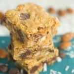 Bake for about 40 minutes, or until a knife inserted into the center of the blondies comes out clean. The blondies should pull away from the sides of the pan a little and the top should be a nice honey brown. Transfer the pan to a rack and cool completely. Cut into bars; store in an airtight container at room temperature.