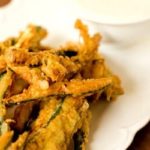 Heat the oil in a large Dutch oven until it reaches 375 degrees F. Working with one batch of zucchini fries at a time, drop them into the batter, making sure each one is coated. Using tongs, gently add them to the oil and fry until golden brown, about 4 to 5 minutes. Remove from the oil with a slotted spoon and drain on a paper towel-lined pan. Allow the oil to come back up to temperature, and then repeat until all of the zucchini has been fried. Serve with ranch dressing or a spicy mayonnaise.