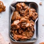 Remove the mixture from the heat and stir in the pecans and bourbon until the nuts are evenly coated. Switch to a wooden spoon and stir vigorously until the mixture thickens, about 3 to 5 minutes.