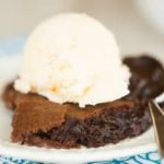 Scrape the brownie mixture into the prepared baking dish, and place into a larger baking pan. Add enough hot tap water to come halfway up the sides of the baking dish. Bake for 1 hour, at which point a tester inserted 2 inches from the side of the pan will come out with some moist crumbs still attached and the center will appear under-baked. Remove the baking dish from the larger pan and place on a wire rack to cool completely. Serve at room temperature. Leftovers should be stored, covered, in the refrigerator for up to 3 days.