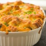 Turn the mixture into a 1½-quart baking dish, pressing down if necessary (the mixture will sit about 1-inch about the top of the dish). Sprinkle the top with the cheddar cheese and bake for 15 to 20 minutes, until the strata is set and the top is golden brown. Sprinkle chopped chives on top and serve. Leftovers can be stored in the refrigerator for up to 3 days.