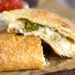 Working with one piece of dough at a time, roll into a 9-inch circle. Spread one-sixth of the ricotta mixture on the bottom half of the dough round, leaving a 1-inch boarder. Top with your desired fillings, then top with one-sixth of the remaining mozzarella and provolone cheeses. Fold the top half of the dough over the filled bottom half, leaving a ½-inch layer of the bottom layer uncovered. With your fingertips, lightly press around the cheese filling and out to the edge to lightly seal the dough. Begining at one end of the calzone, place an index finger diagonally across the edge and gently pull the bottom layer of dough over the tip of your index finger; press into dough to seal. Repeat until the calzone is fully sealed. With a paring knife, cut 5 slits, about 1½ inches long, diagonally across the top of the calzone. Repeat with the remaining balls of dough until all of the calzones are assembled.