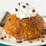Meanwhile, in a shallow bowl, combine the crushed cornflakes, coconut and cinnamon. Roll the balls of ice cream in the coating, packing them together into a smooth ball. Return the coated ice cream to the baking sheet and freeze for at least 30 minutes.