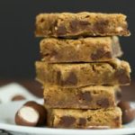 Reduce the mixer speed to low and add the flour mixture in two batches, mixing just until combined. Add the malted milk balls and chocolate chips and beat until just combined, about 10 seconds. Turn the mixture out into the prepared pan and use an offset spatula to spread it evenly.