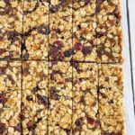 Transfer the mixture to the prepared pan and press into an even, compact layer. Cover with plastic wrap and refrigerate for 30 minutes to firm up. Remove from the pan, transfer to a cutting board, and slice into bars. The granola bars can be stored in an airtight container at room temperature for up to 1 week, or wrapped individually in plastic wrapped, placed in a freezer bag, and stored in the freezer for up to 2 months.