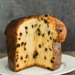 A recipe for Panettone, Italian Christmas bread, with a brioche-like dough infused with a vanilla bean and studded with rum-soaked raisins and candied orange peel.