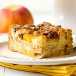 Spread half of the batter evenly into the bottom of the pan. Top with half of the peaches, then sprinkle with two-thirds of the cinnamon sugar. Drop the remaining batter on top of the peaches in small mounds, then use an offset spatula to gently spread it into an even layer, covering the peaches. Arrange the remaining peaches on top and sprinkle with the remaining cinnamon sugar and the pecans.