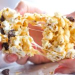 Turn the popcorn mixture out into the prepared pan and sprinkle with the chocolate chips. Using a spatula or wooden spoon coated in non-stick cooking spray, press into a compact, even layer.