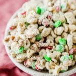 Reindeer chow is a delicious sweet and salty holiday snack! Rice Chex, Cheerios, peanuts, pretzels, and M&Ms are coated in melted white chocolate; delicious!
