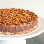Pour the batter into the prepared pan, smooth into an even layer, and arrange the pretzels on top. Bake until a toothpick inserted near the edge comes out clean and the center is just set, 25 to 35 minutes. Remove from the oven and let sit at room temperature for 10 minutes, then chill in the refrigerator for at least 3 hours before serving.