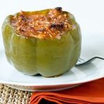 Place the peppers cut-side up in a baking dish large enough to hold them all (it will vary depending on the size of your peppers). Using a large spoon, divide the filling evenly amount the peppers. Drizzle a little of the beef broth evenly over top of the peppers, and then pour the rest into the bottom of the pan. Bake until heated through, 25 to 30 minutes. Serve immediately.