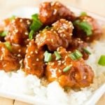 Sesame Chicken - Marinated, battered and fried, tossed in a sweet sesame sauce and served over white rice, sprinkled with sesame seeds and chopped scallions.