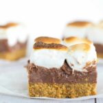 Immediately place the marshmallows on top of the chocolate layer, pressing down slightly to nestle them into the chocolate. When ready to serve, turn on your oven's broiler and place the pan on the center rack. Broil until the marshmallows are puffed and browned, 1 to 2 minutes. Remove from the oven and let cool briefly, then slice and serve (I used a large pizza cutter sprayed with non-stick cooking spray to slice mine). Leftovers can be stored in an airtight container for up to 4 days.