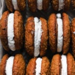 Assemble the whoopie pies: Pipe or spread (whatever your preferred method) a layer of chocolate ganache filling onto the flat side of one of the cakes. Using the same method, top the chocolate filling with the marshmallow filling. Top it with another cake, flat-side down. Repeat with the rest of the cakes and filling.
