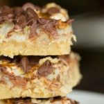 Remove from the oven, then sprinkle the chopped pecans over the crust, and top with the shredded coconut. Pour the sweetened condensed milk evenly over top, then drizzle with the melted caramel sauce. Sprinkle with chocolate chips and return to the oven until the edges are light brown, 20 to 25 minutes.