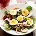 Arrange the spinach on plates and top with an equal amount of bacon, mushrooms, onion and sliced eggs. Sprinkle with salt and pepper, drizzle the warm dressing over top and serve. Any leftover dressing can be stored in an airtight container in the refrigerator.