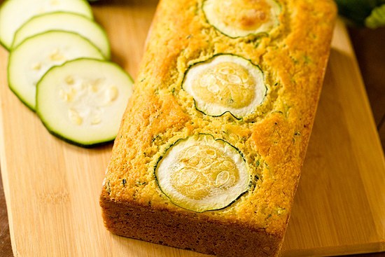 - In a large bowl, whisk together the flour, sugar, cornmeal, baking powder, baking soda and salt. In a medium bowl, whisk together the butter, eggs and buttermilk. Gently stir the zucchini into the butter mixture. Pour the wet ingredients into the flour mixture and use a rubber spatula to gently fold together until no traces of flour remain. Pour the batter into the prepared loaf pan and top with the reserved zucchini slices.